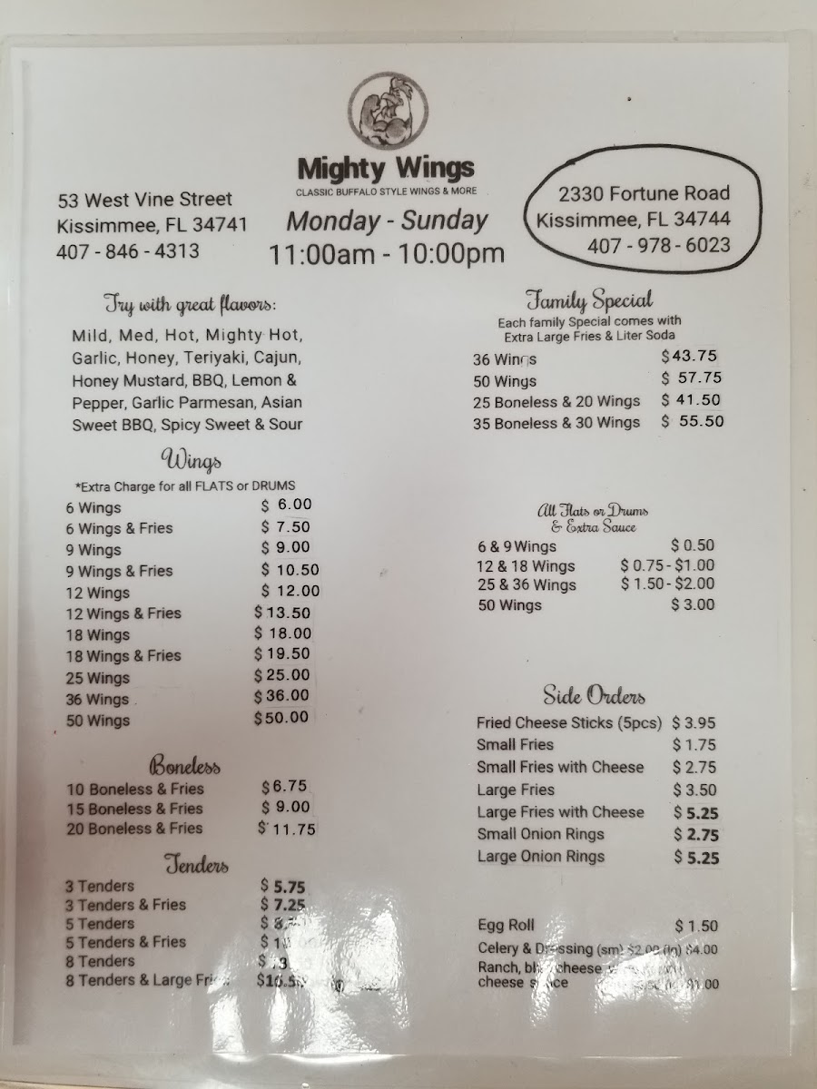 Welcome to Mighty Wings, a wing lover's paradise located in Kissimmee, Florida. Here, every meal tells a flavorful story, bursting with deliciousness and freshness. The menu is a celebration of culinary simplicity, featuring both boneless and bone-in wings available in a variety of mouthwatering sauces.